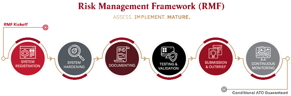 To obtain a DoD Authority to Operate (ATO), do you have to evaluate your information systems in accordance with DoD RMF standards? We can assist you in evaluating your information systems in accordance with DoD RMF requirements with our DoD RMF certification and accreditation service. We offer RMF help to the Department of Defense agencies using NIST Special Publication (SP) 800-53, the RMF framework’s six stages (see below), and our wealth of knowledge.